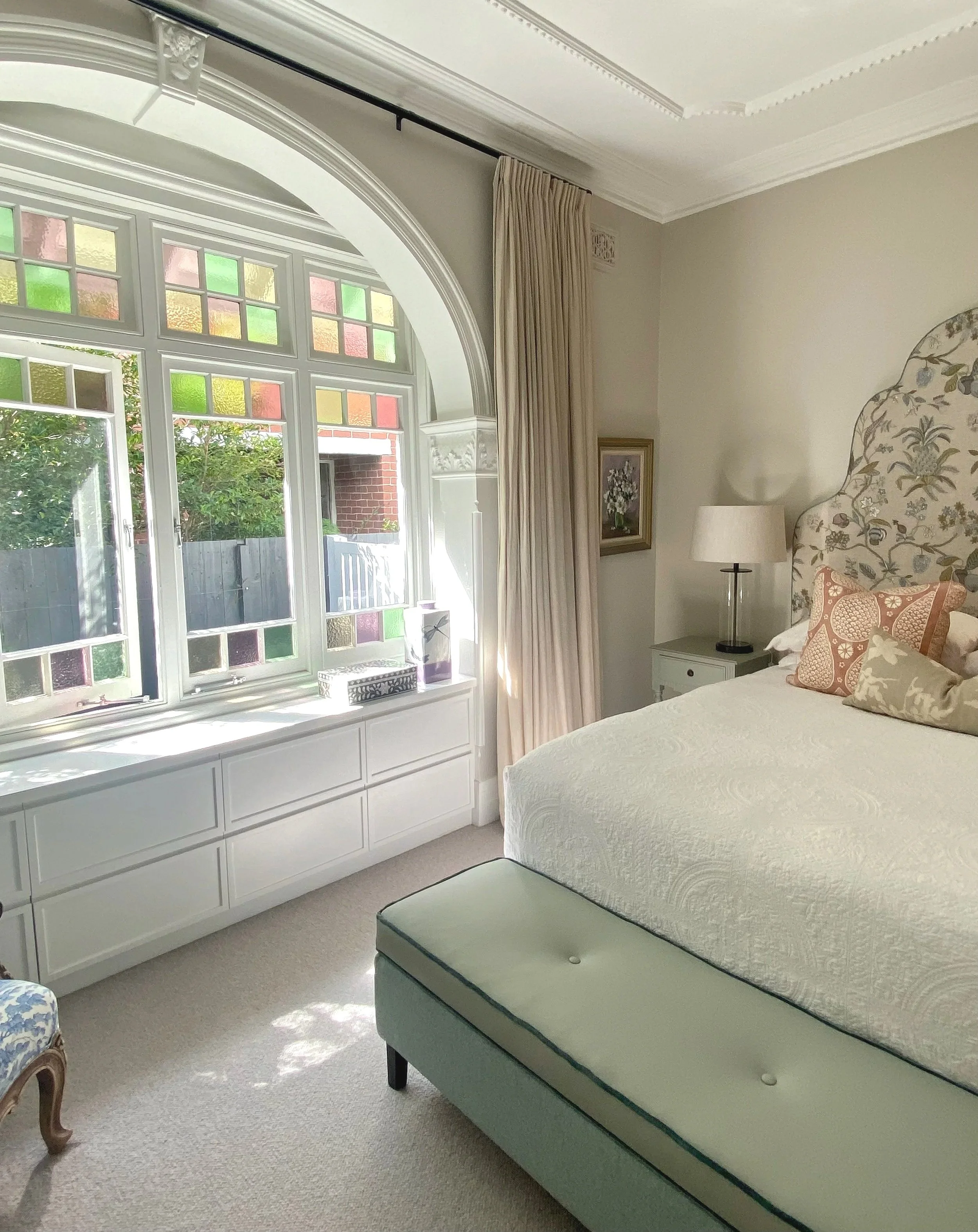 The interior scheme was designed to honour the home’s character while creating a light, functional environment. Warm whites provide a timeless backdrop, offset by black detailing - most notably a bespoke arched steel door that marks the transition from old to new. Custom joinery with oak accents introduces warmth and texture, while refined fixtures and finishes ensure complete cohesion throughout. The final layer was added through custom soft furnishings including dramatic bedheads, full length curtains and the re-upholstery of many of the home owners cherised items.
